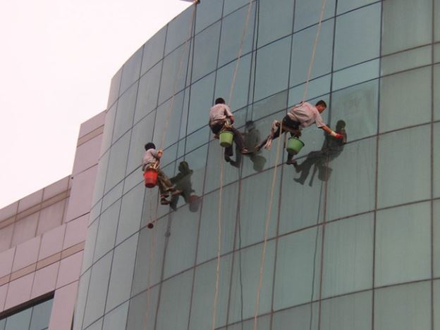 以下是我们的清洗流程:1.在楼顶选定安全固定点,确保牢固可靠,然后将吊绳和副绳(保险绳)分别固定在安全固定点的铆点和支架上。2.使用吊绳在吊板上的U型扣里打一个特殊结,并在板边栓上吊桶。我们会进行专人检查验收,确保绳子与建筑物墙角接触部位加有橡胶绳套或安全垫,以防磨损。3.将吊板、自锁器与吊绳紧密连接,确保安全可靠。4.操作人员必须系好安全带,并将自锁器与副绳(保险绳)牢固连接,以确保作业安全。5.操作人员将清洗剂、玻璃刮洗器、抹水器、抹布等备用工具装入吊桶中,然后坐在吊板上缓缓下降,呈悬挂状态。6.到达工作位置后,首先喷水湿润要清洗的部位,用玻璃刮洗器、抹水器、抹布等工具初步除去污垢。接着,将清洁剂均匀涂在玻璃或墙面上,稍后使用外墙刷进行擦拭。最后,用清水将清洁剂及污水冲洗干净。完成一个位置的清洁后,缓缓调整至下一个位置继续作业,直到一趟作业完成。7.降至地面后,我们会卸下水桶、吊板等工具,并准备开始下一趟高空作业。