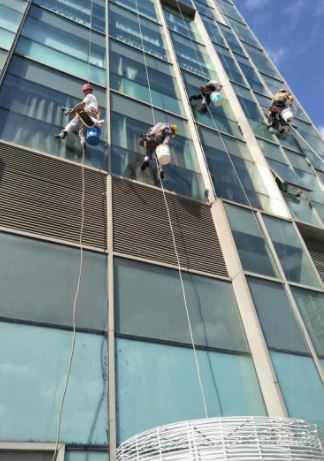 以下是我们的清洗流程:1.在楼顶选定安全固定点,确保牢固可靠,然后将吊绳和副绳(保险绳)分别固定在安全固定点的铆点和支架上。2.使用吊绳在吊板上的U型扣里打一个特殊结,并在板边栓上吊桶。我们会进行专人检查验收,确保绳子与建筑物墙角接触部位加有橡胶绳套或安全垫,以防磨损。3.将吊板、自锁器与吊绳紧密连接,确保安全可靠。4.操作人员必须系好安全带,并将自锁器与副绳(保险绳)牢固连接,以确保作业安全。5.操作人员将清洗剂、玻璃刮洗器、抹水器、抹布等备用工具装入吊桶中,然后坐在吊板上缓缓下降,呈悬挂状态。6.到达工作位置后,首先喷水湿润要清洗的部位,用玻璃刮洗器、抹水器、抹布等工具初步除去污垢。接着,将清洁剂均匀涂在玻璃或墙面上,稍后使用外墙刷进行擦拭。最后,用清水将清洁剂及污水冲洗干净。完成一个位置的清洁后,缓缓调整至下一个位置继续作业,直到一趟作业完成。7.降至地面后,我们会卸下水桶、吊板等工具,并准备开始下一趟高空作业。